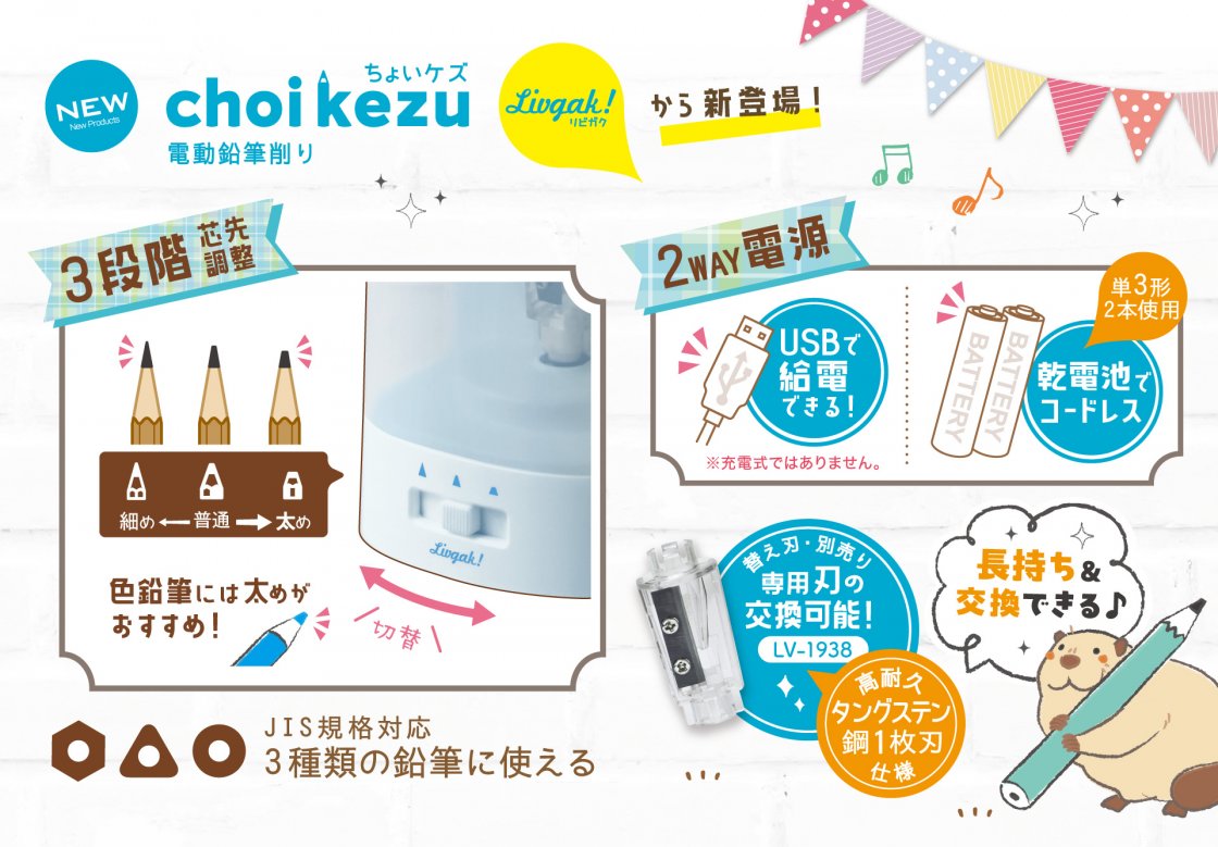 ちょいケズ 電動鉛筆削り 芯先調整付 乾電池・USB両対応 リビガク