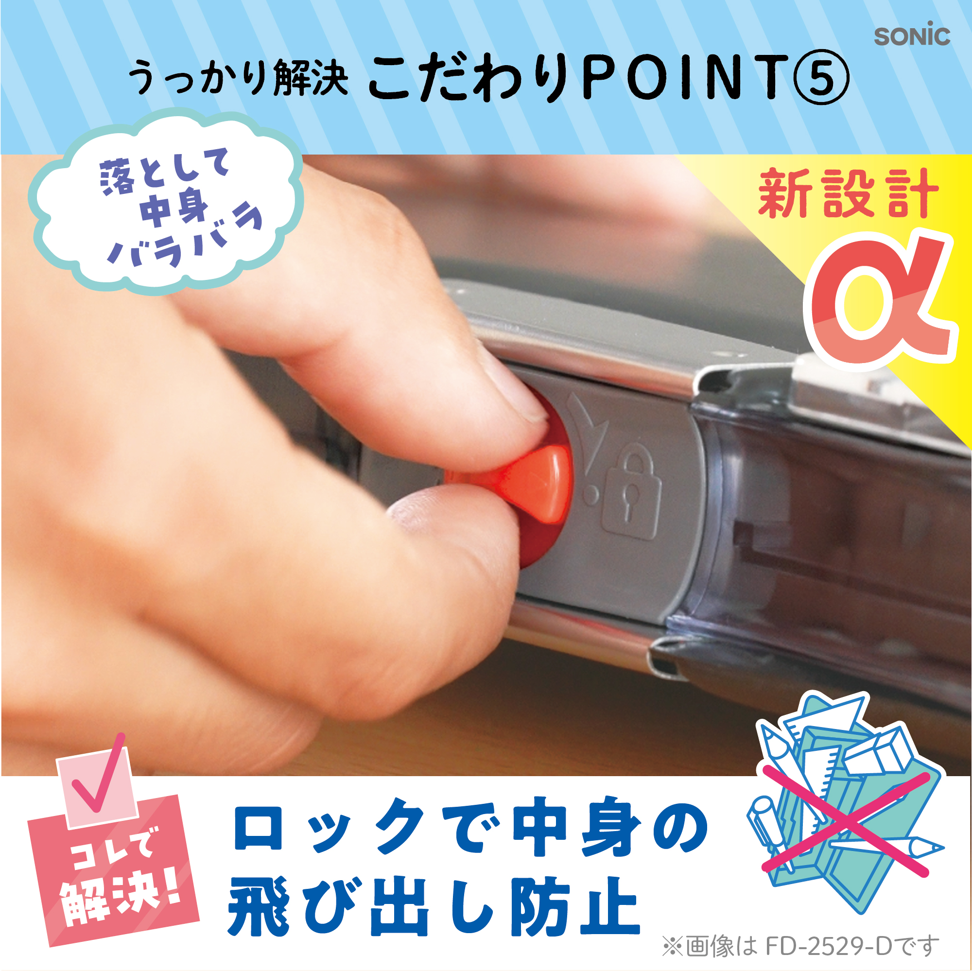 筆入が激しく揺れても中身が飛び出さないロック機能が付いた両面筆入