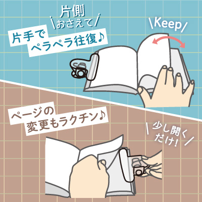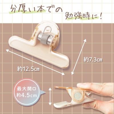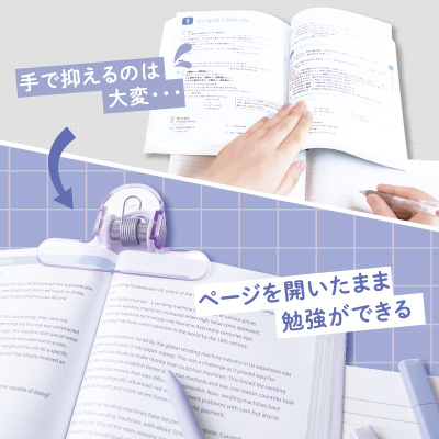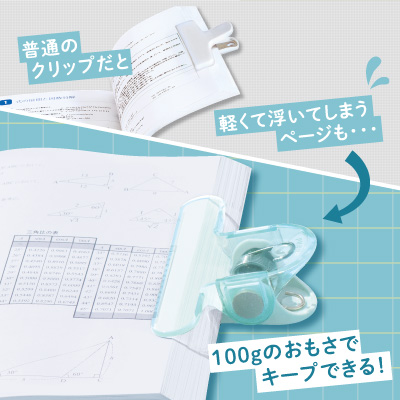 分厚い本も、おもさで開いたままキープ! 本閉じストレス0なブック用クリップ。 挟んでも文字が透けて見えるので集中力も持続、スタディーパフォーマンスUP! 本の片側(小口)・上側(天)どちらもはさめる2WAYタイプ。